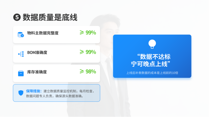 物料主数据完整度≥99%,BOM准确度≥99%,库存准确度≥98%。