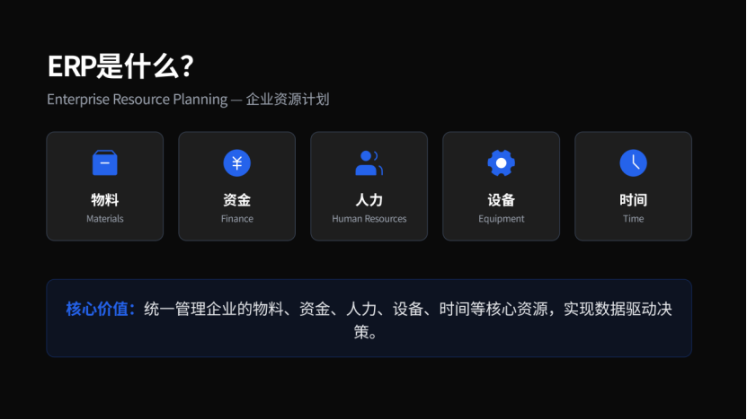 它本质上是一个集成化的信息系统,帮你把企业的物料、资金、人力、设备、时间这5类资源统一管起来。