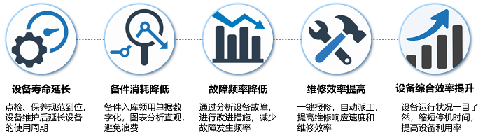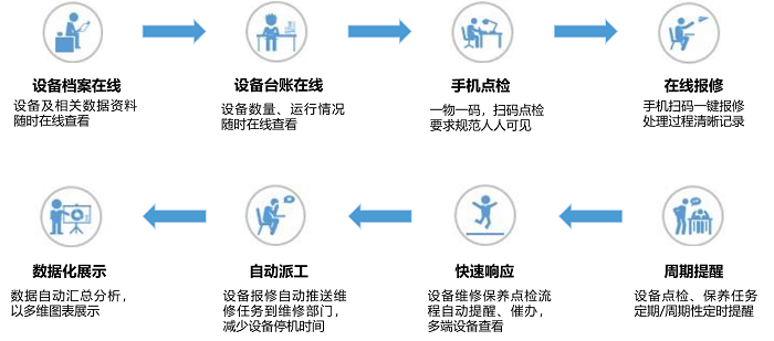 以生产设备点检管理为核心,实现设备保养、维修、配件等管理项目。一物一码,手机扫码快速定位,实现设备管理无纸化,并通过数据分析预警,提升设备管理效率。