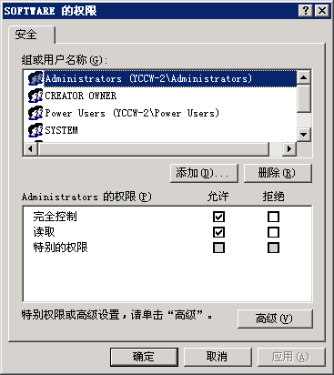 选择到 SOFTWARE 目录后,点击“安全”菜单,选择“权限”,会打开一个权限设置窗口。