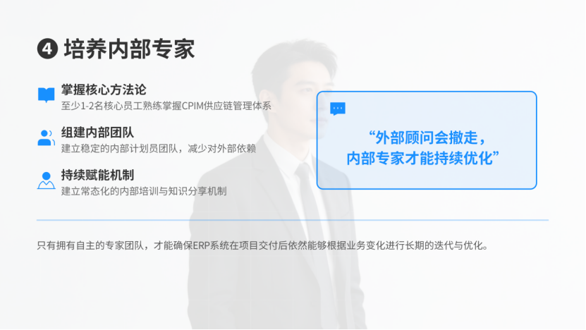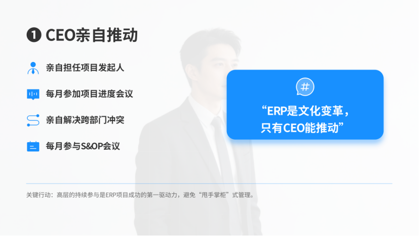 不是交给CIO,不是交给IT部门。CEO必须担任项目发起人,每月参加进度会议,亲自解决跨部门冲突。