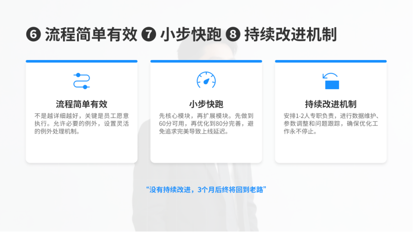 专职1-2人负责持续优化,数据维护、参数调整、问题跟踪,永不停止。